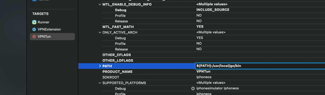 Add a user defined variable to both runner and VPNExtension targets' build settings with key PATH and value ${PATH}/path/to/bin/folder/with/go/executable, e.g. ${PATH}:/usr/local/go/bin.
